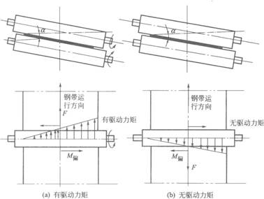 若辊子是带驱动的,给不锈钢带的作用力是向前的动力,则不锈钢带所受到的向前的动力的合力偏向不锈钢带被夹紧的一端,会产生一个使不锈钢带向这一方向偏移的力偶M偏,所以不锈钢带是向着压力大、辊子开口小的一端偏移。若辊子是从动的,给不锈钢带的作用力是向后的阻力,则会使不锈钢带向压力小、辊子开口大的一端偏移。